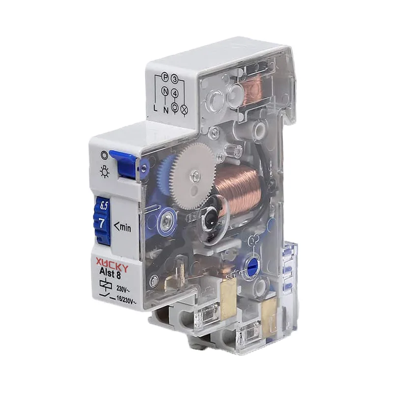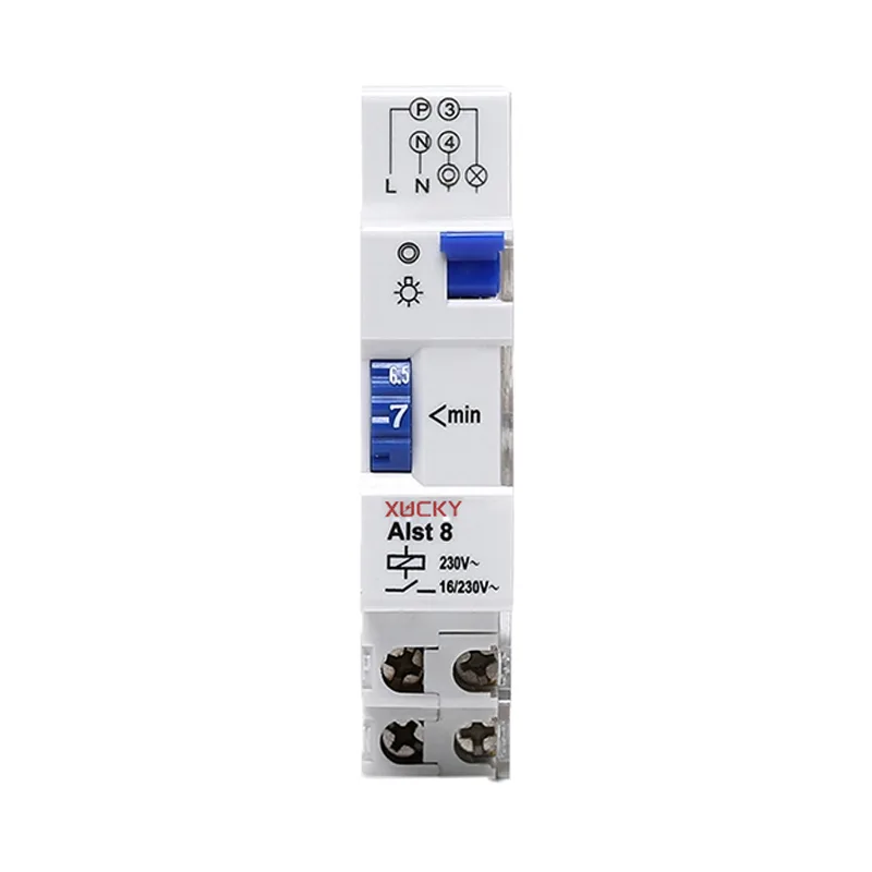 XUCKY automatische lichtschakeltimer van hoge kwaliteit, een ALST8 trappenhuistijdschakelaar is verkrijgbaar in DIN-rail. De looptijd varieert van 1 minuut tot 7 minuten en is voorzien van elektronische overbelastingsbeveiliging.