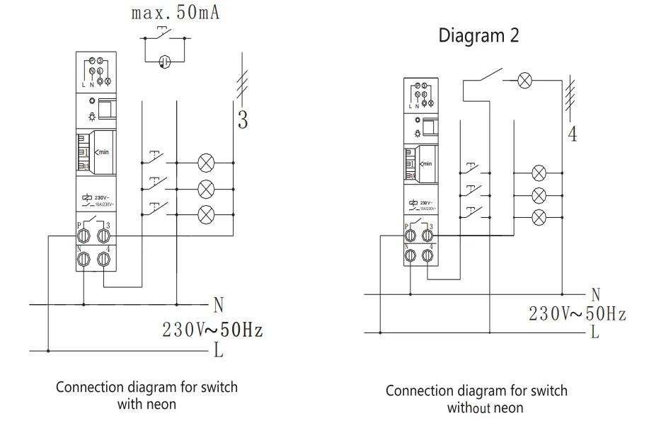 2.De tijdschakelaar maakt verbinding met een schakelaar mogelijk (met of zonder neonlicht).