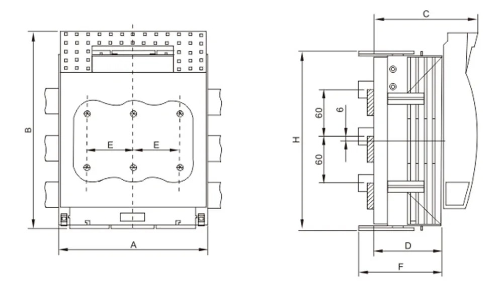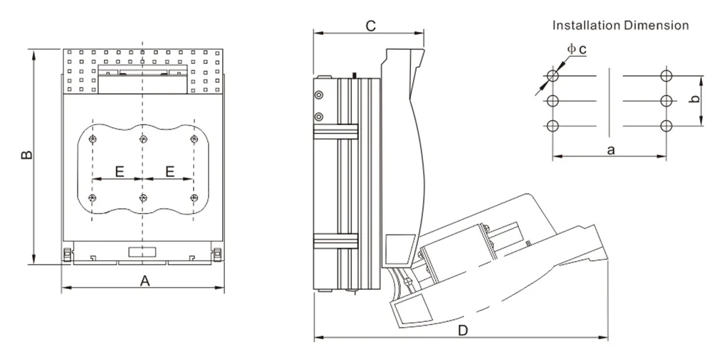 Overzicht en installatieafmetingen van het HR17B-160~630A hangende type