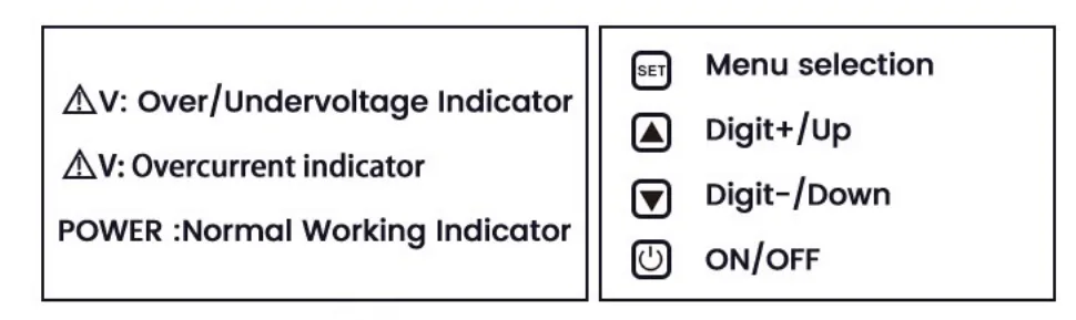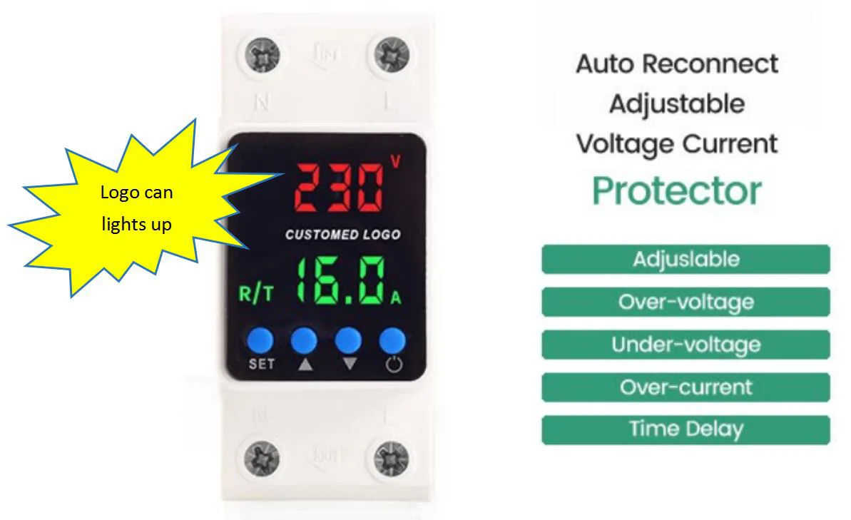 Overspanningswaarde, onderspanningswaarde en stroombeveiligingswaarde kunnen handmatig worden ingesteld (houd de insteltoets 5 seconden ingedrukt om het menu te openen). U kunt ook de weergavemodus instellen en zelfs de weergave van uw bedrijfslogo aanpassen!