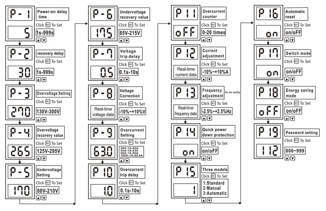 Modus 3 (Auto) geeft automatisch spanning (-u-), vermogen (-P-), stroom (A-) en frequentie (-H-) weer in die volgorde. Voor parameter P19 (wachtwoord) is het initiële wachtwoord ingesteld op 112. U kunt het wachtwoord opnieuw instellen nadat u de blokkeringsparameters hebt gewijzigd. Om te ontgrendelen moeten de parameters worden hersteld naar het oorspronkelijke wachtwoord (112).
